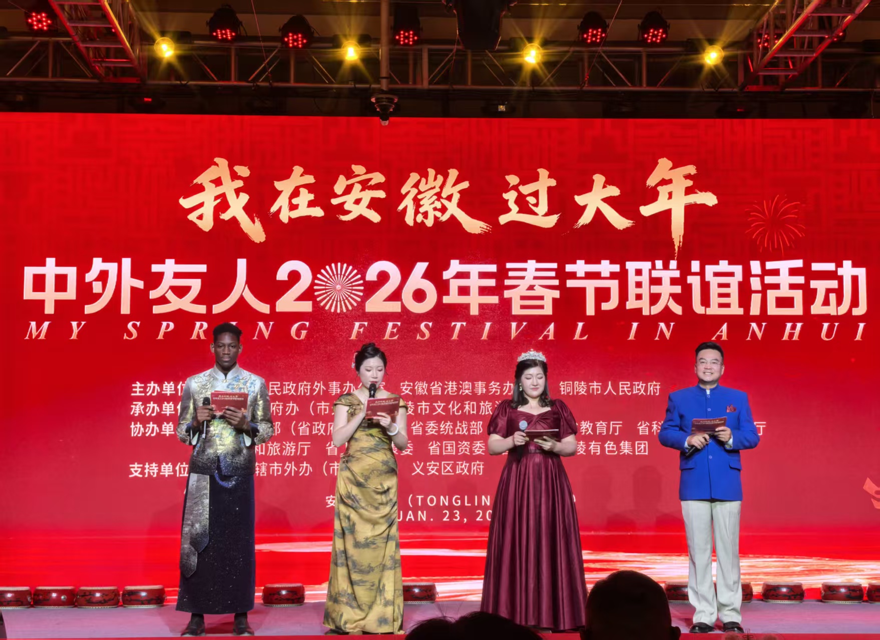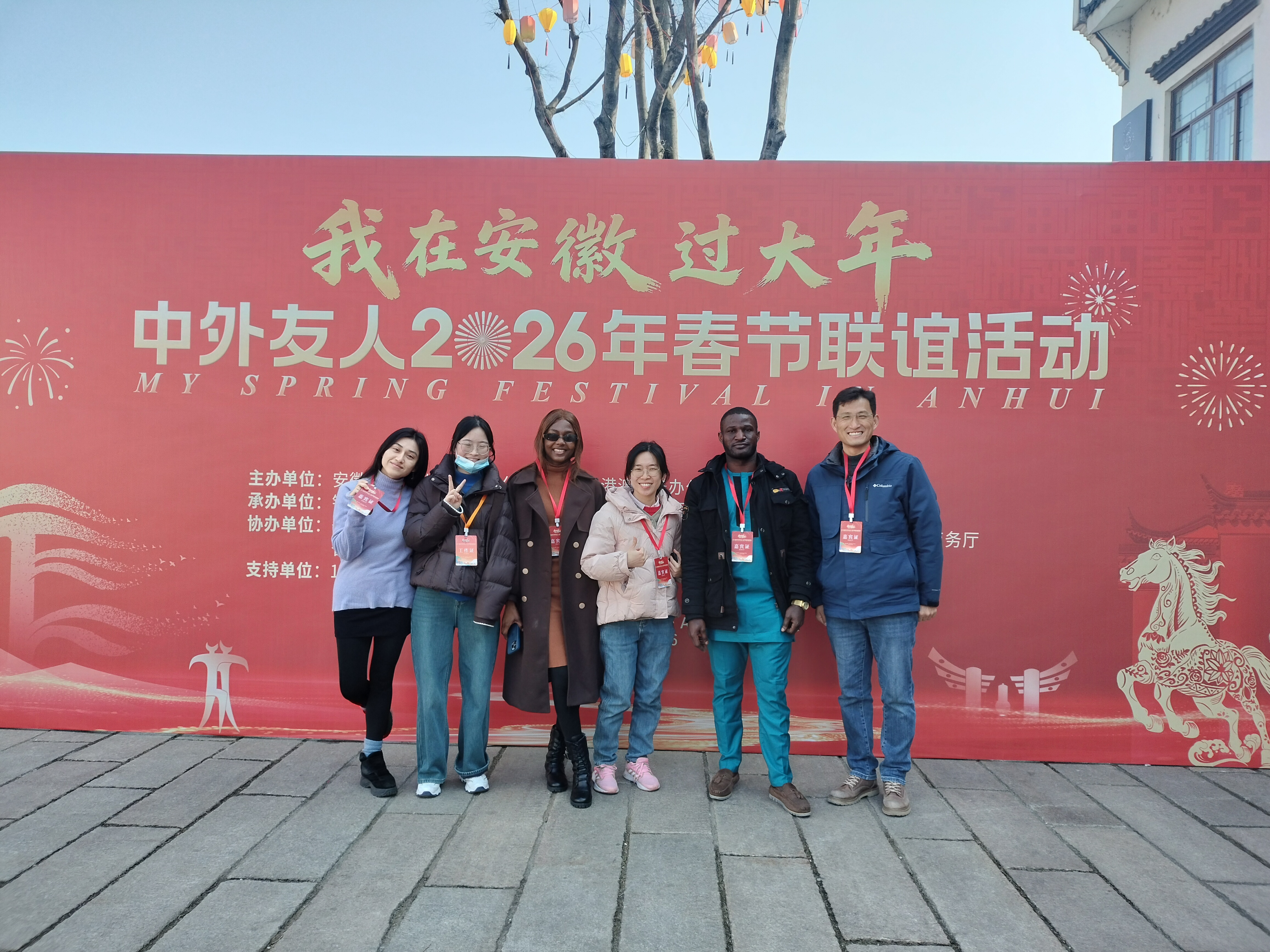 1月23日,由安徽省人民政府外事办公室(港澳台办公室)与铜陵市政府联合主办的“我在安徽过大年”中外友人2026年春节联谊活动在铜陵市梨桥水镇成功举办,安徽省副省长孙勇出席活动并致辞,来自美国、德国、法国、加拿大等59个国家和地区的140余名外籍友人与港澳同胞,共品徽风皖韵,共庆新春佳节,共话交流合作。我校马来西亚籍教师李冰欣和4名国际学生受邀参加了活动。