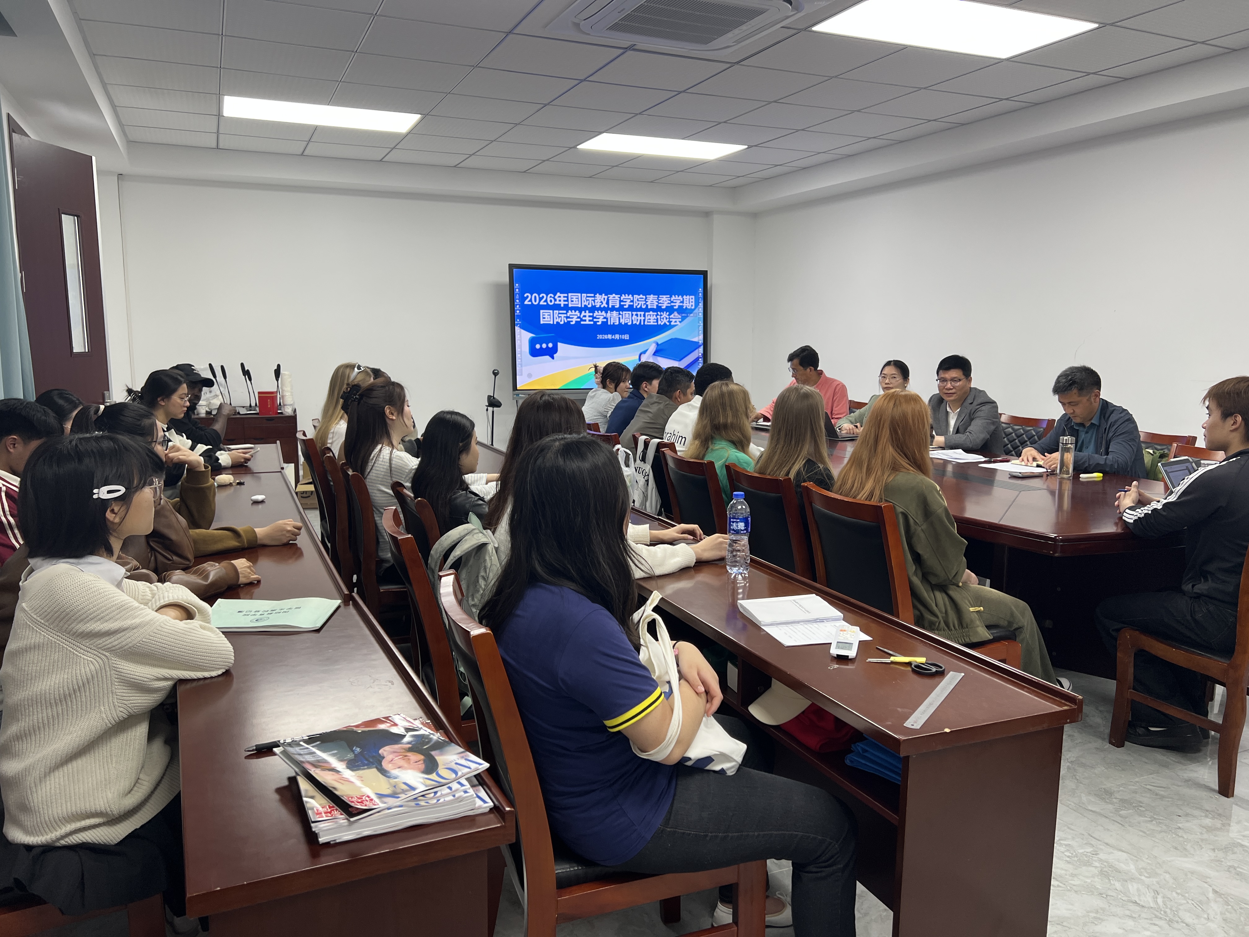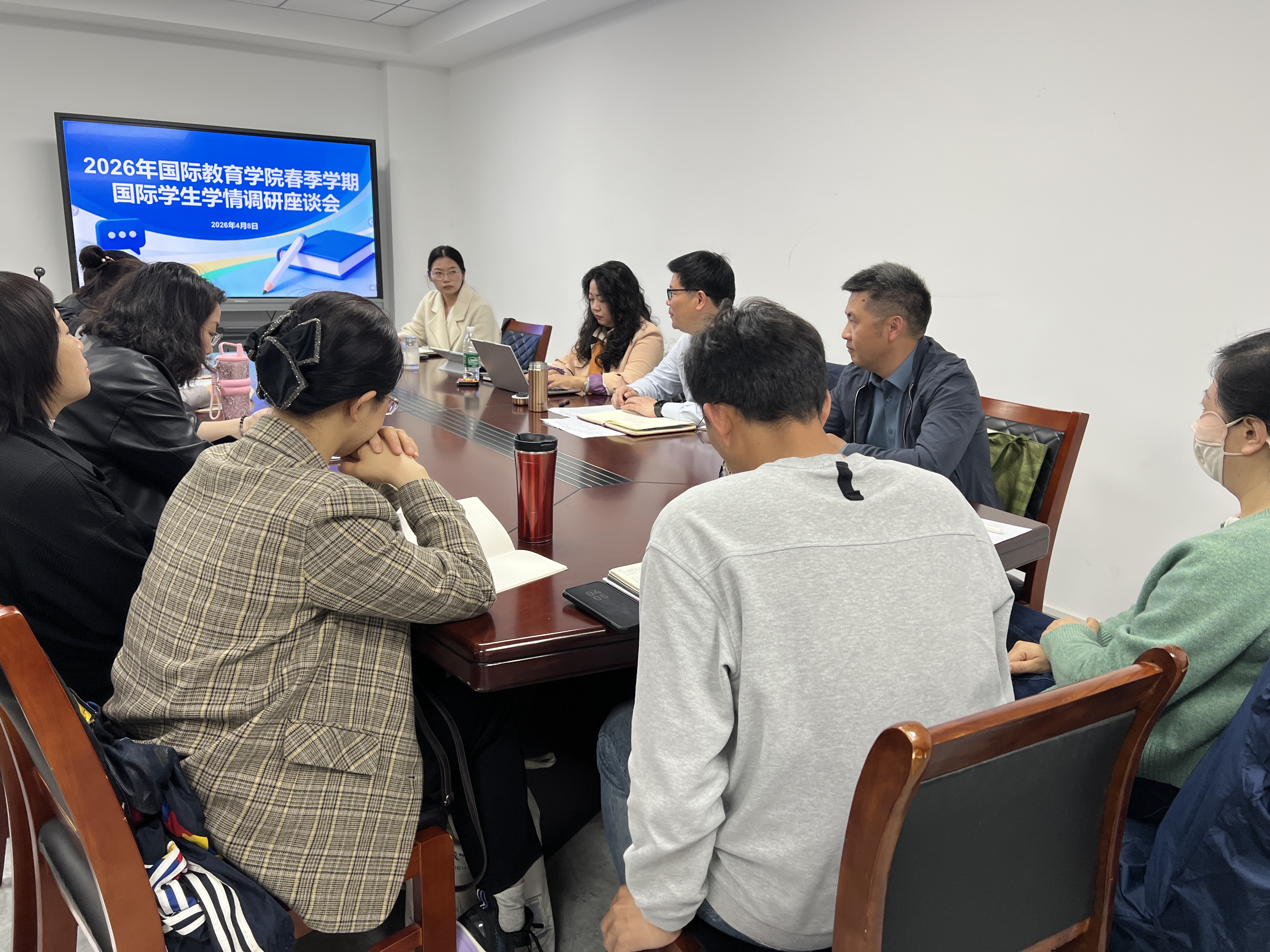 为精准掌握2026年春季学期教情学情,及时了解学生学习需求与教学实际情况,搭建师生高效沟通的桥梁,持续优化国际人才培养模式,4月8日和10日下午,学院召开2026年春季学期国际学生学情调研座谈会。学院直属党支部书记、院长杨一飞主持会议,副院长徐建,各科室负责人、学生代表和教师代表参会。